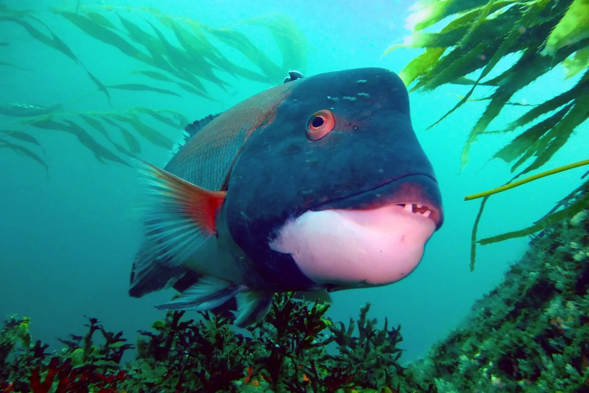 California sheephead are easily recognizable by their distinctive black and red coloring. They are also one of the biggest, toothiest fish in the kelp forest. They live in small groups along the rocky coastline of California. By day they forage for food, but at night they cover themselves in mucus and hide under rocks or in crevices to stay out of the eyes of predators.