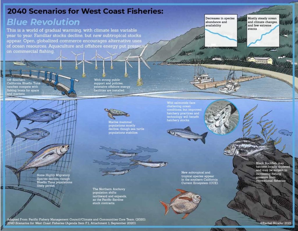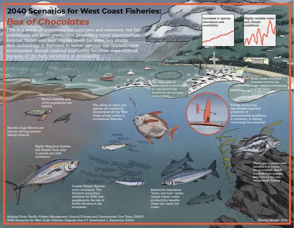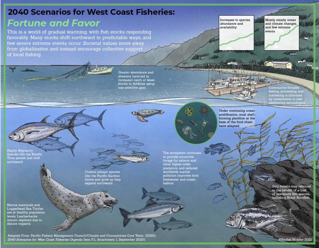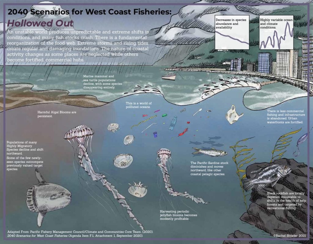Climate change is already taking a toll on West Coast fisheries and fishing communities. The Pacific Fishery Management Council is using a tool called scenario planning to understand what the future might look like and how to respond to change. As part of this process, fishermen and fisheries scientists and managers have created four possible future climate scenarios through which to explore paths forward to prepare and adapt fisheries. Working with biological illustrator Rachel Strader and in collaboration with the Climate and Communities Initiative at the Council, Ocean Conservancy produced these visual representations of the four future climate scenarios.