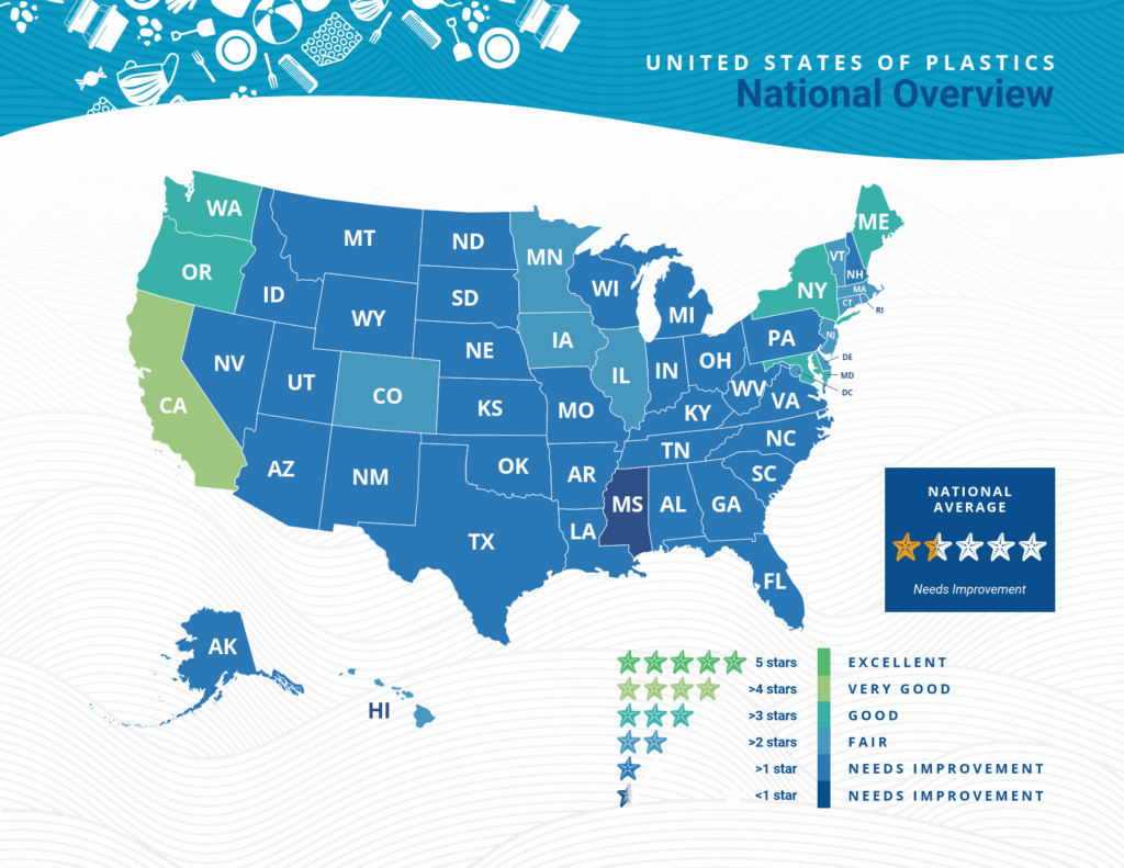 The “United States of Plastics” report analyzes laws to address plastic pollution in all 50 states and Washington, D.C. and assigns a score to each on a five-point scale.